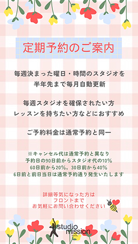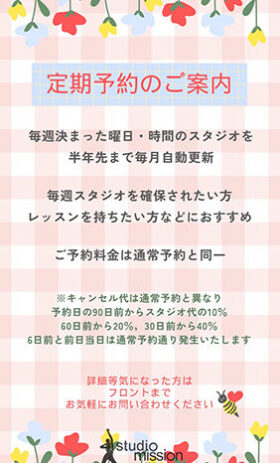 ダンスレッスンやヴォーカルトレーニング等を行う個人〜少人数向けの小型スタジオから、舞台・演劇・ミュージカルの稽古場やダンス練習・ヨガ・ワークショップ・撮影等に最適なスタジオなど、『STUDIO MISSION』は様々な目的にあった、豊富なバリエーションのスタジオタイプの中から用途に合わせお選び頂けます。