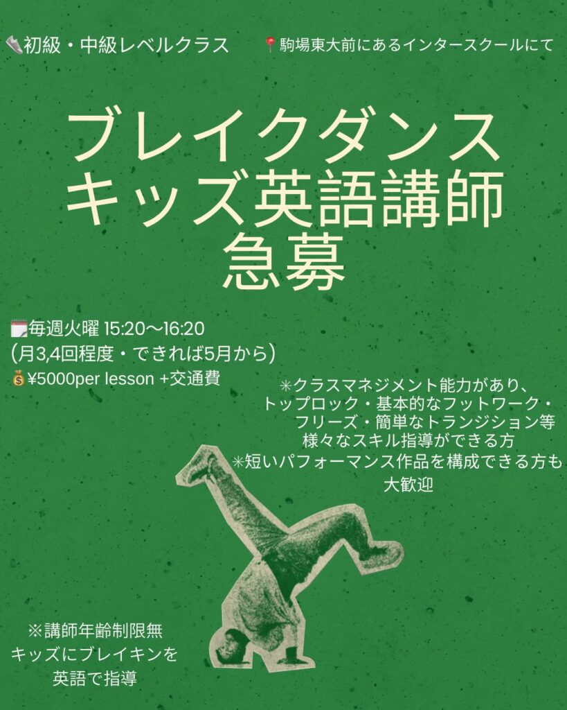 キッズ初級,中級 ブレイクダンス英語講師急募!